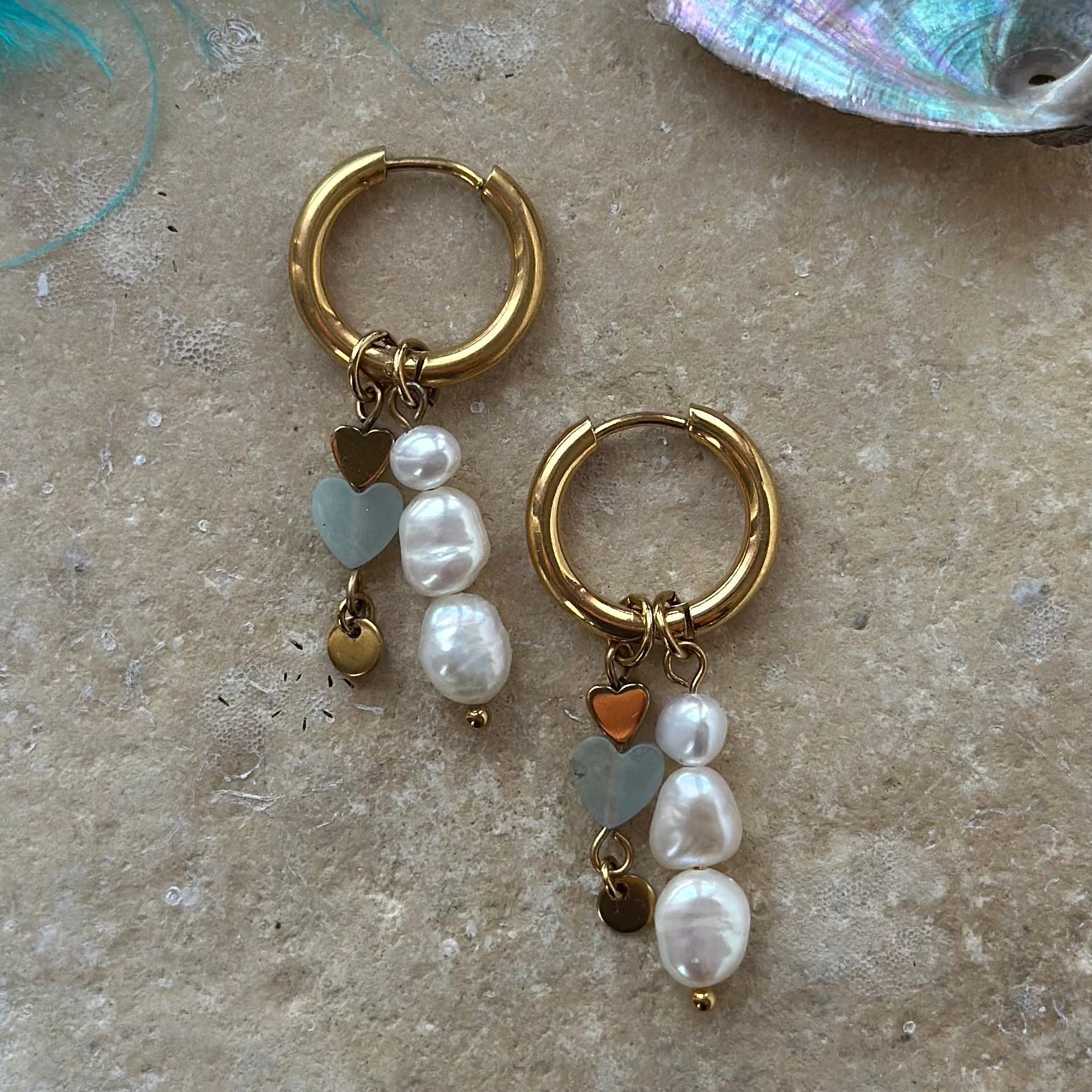 Details: 6 mm Amazonit und 4 mm vergoldete Hämatit-Herzen. 4–8 mm Süßwasserperlen. 17 mm große, 18-karätig ionenvergoldete, hypoallergene Edelstahl-Creolen.