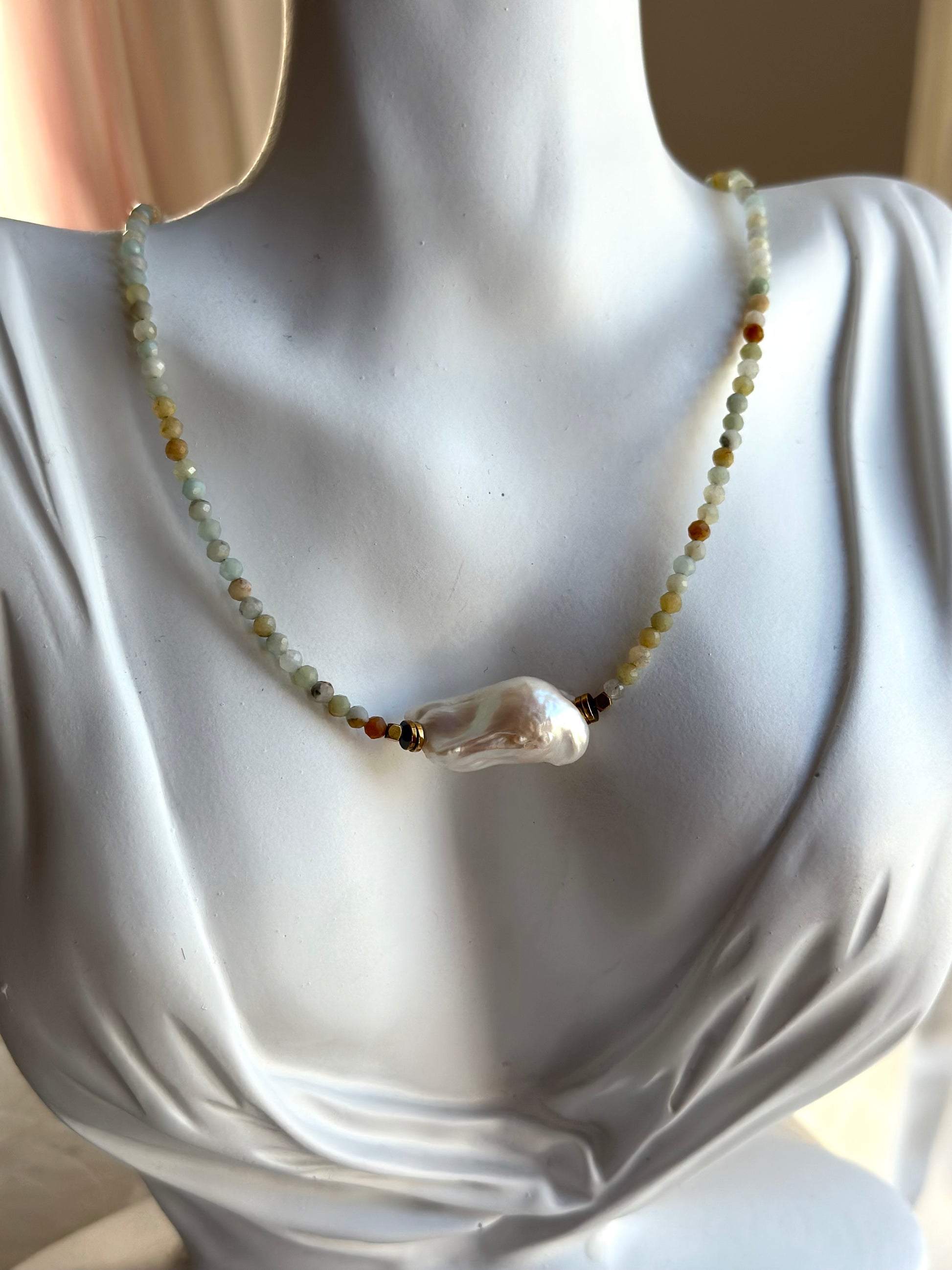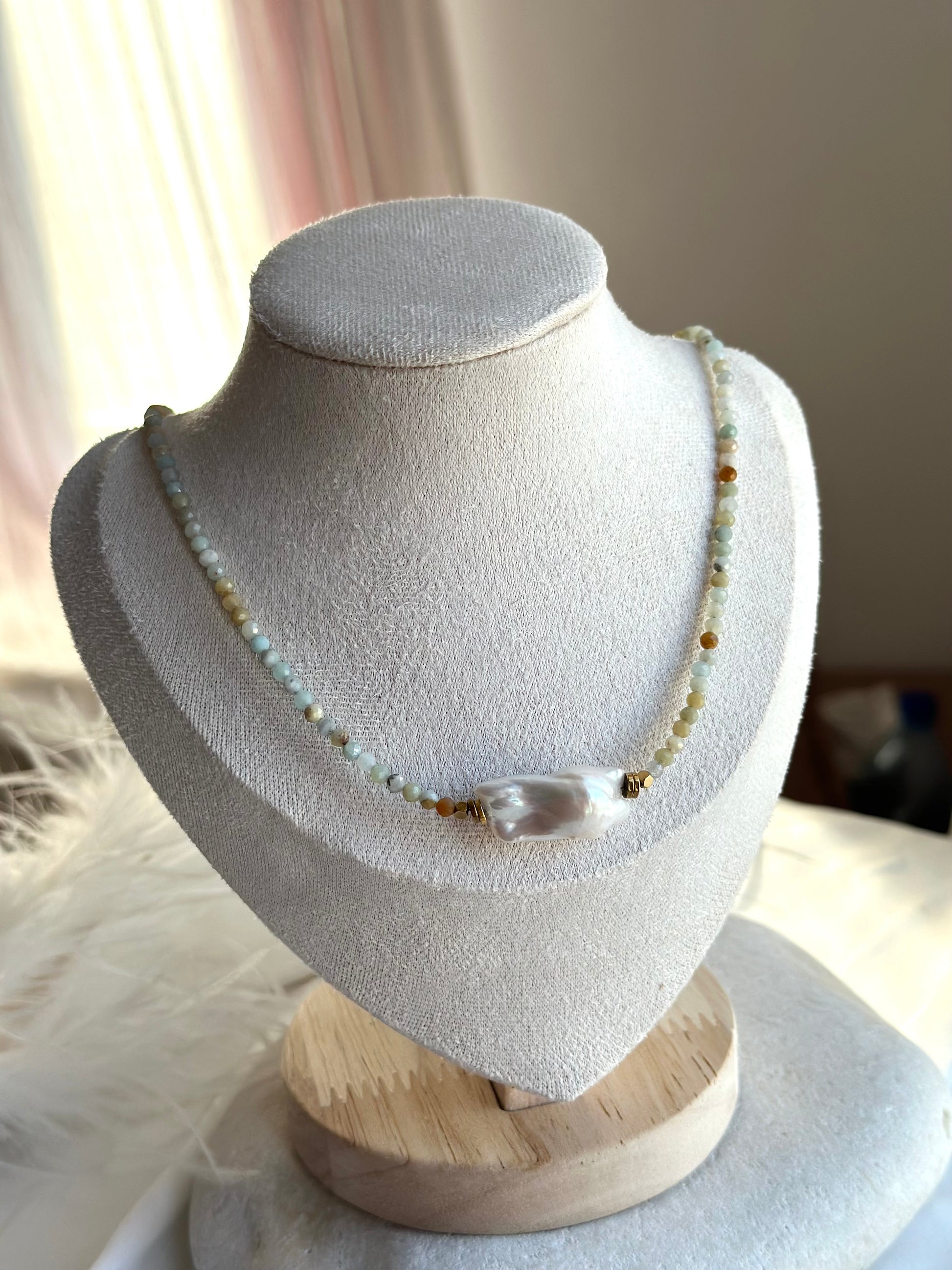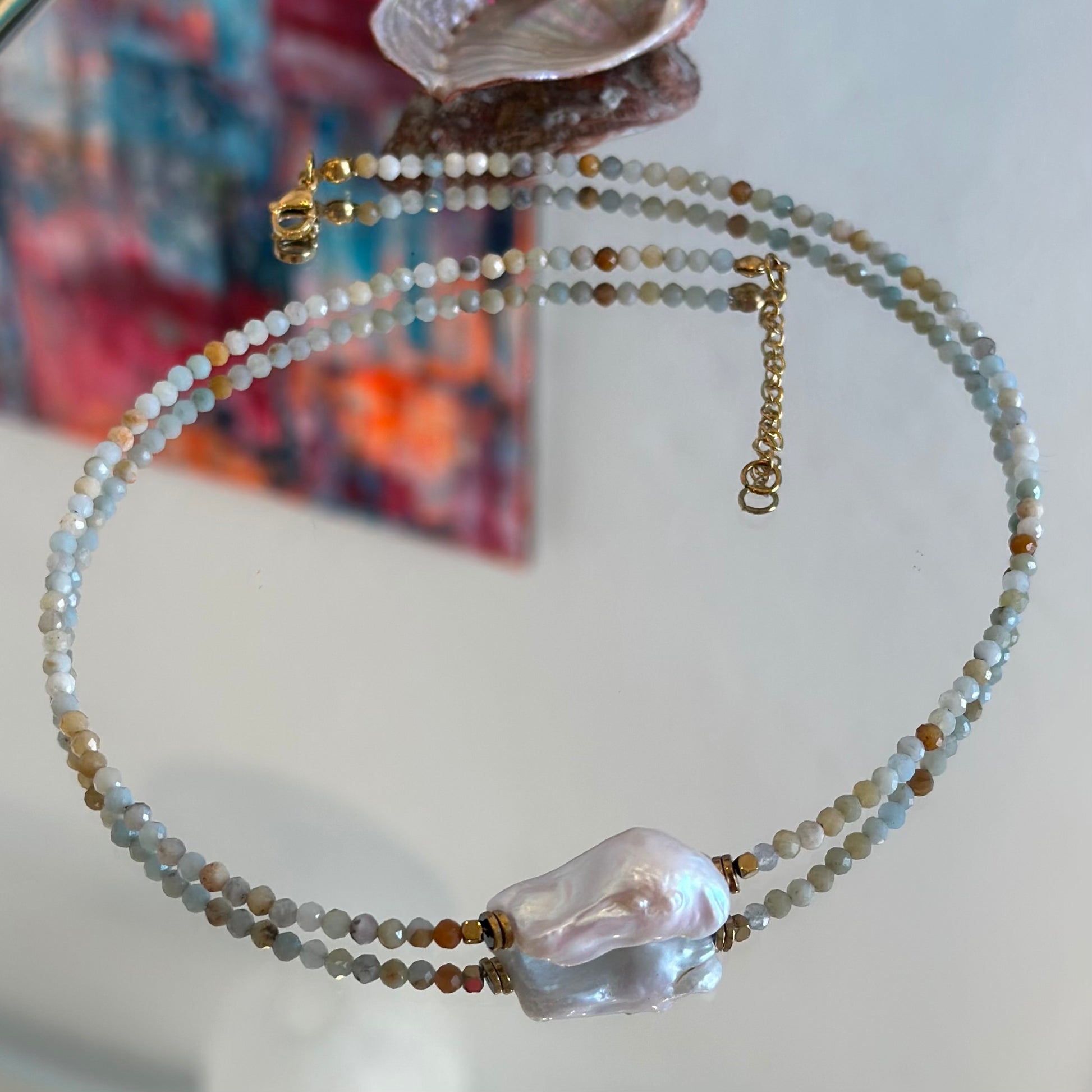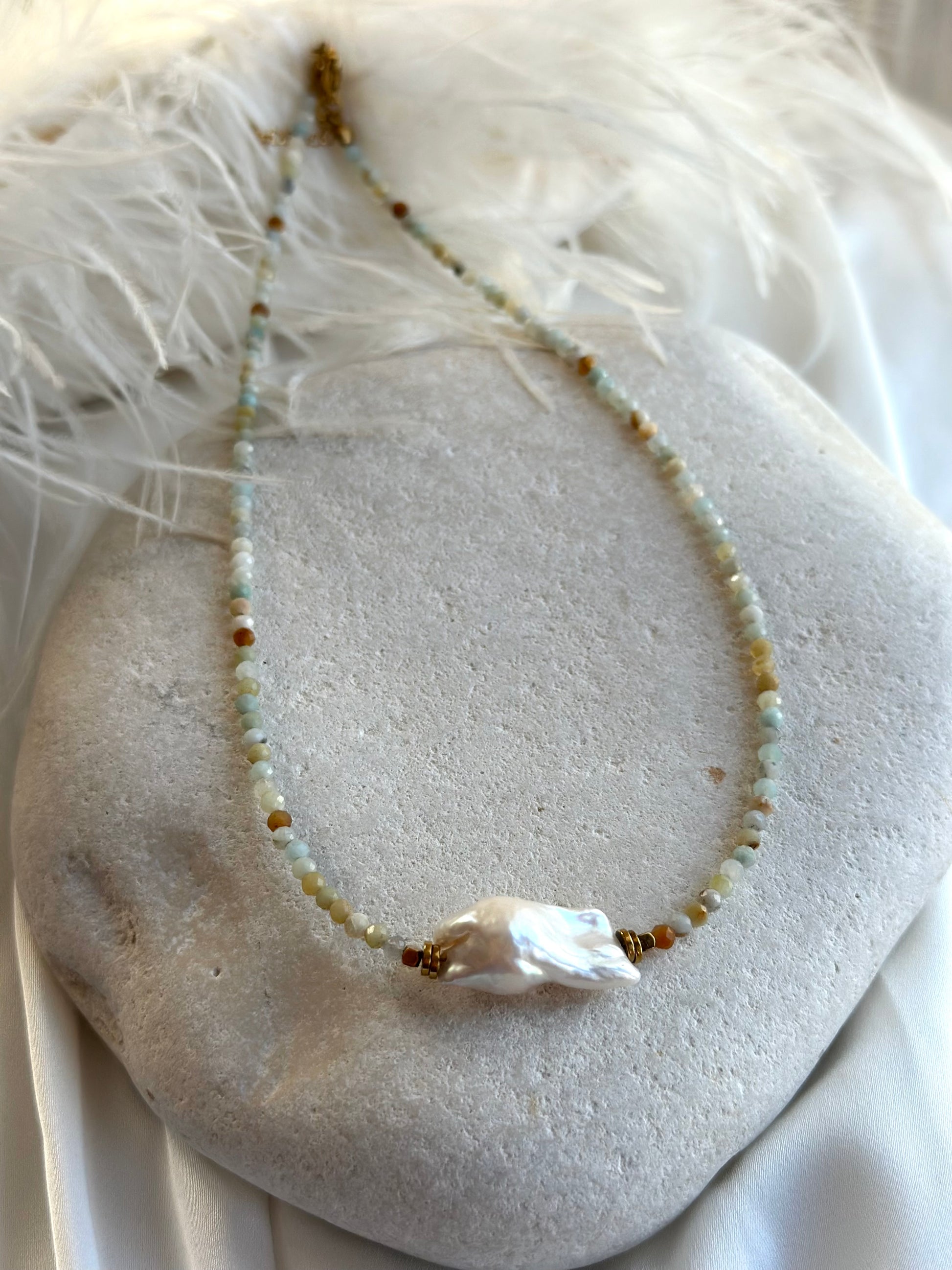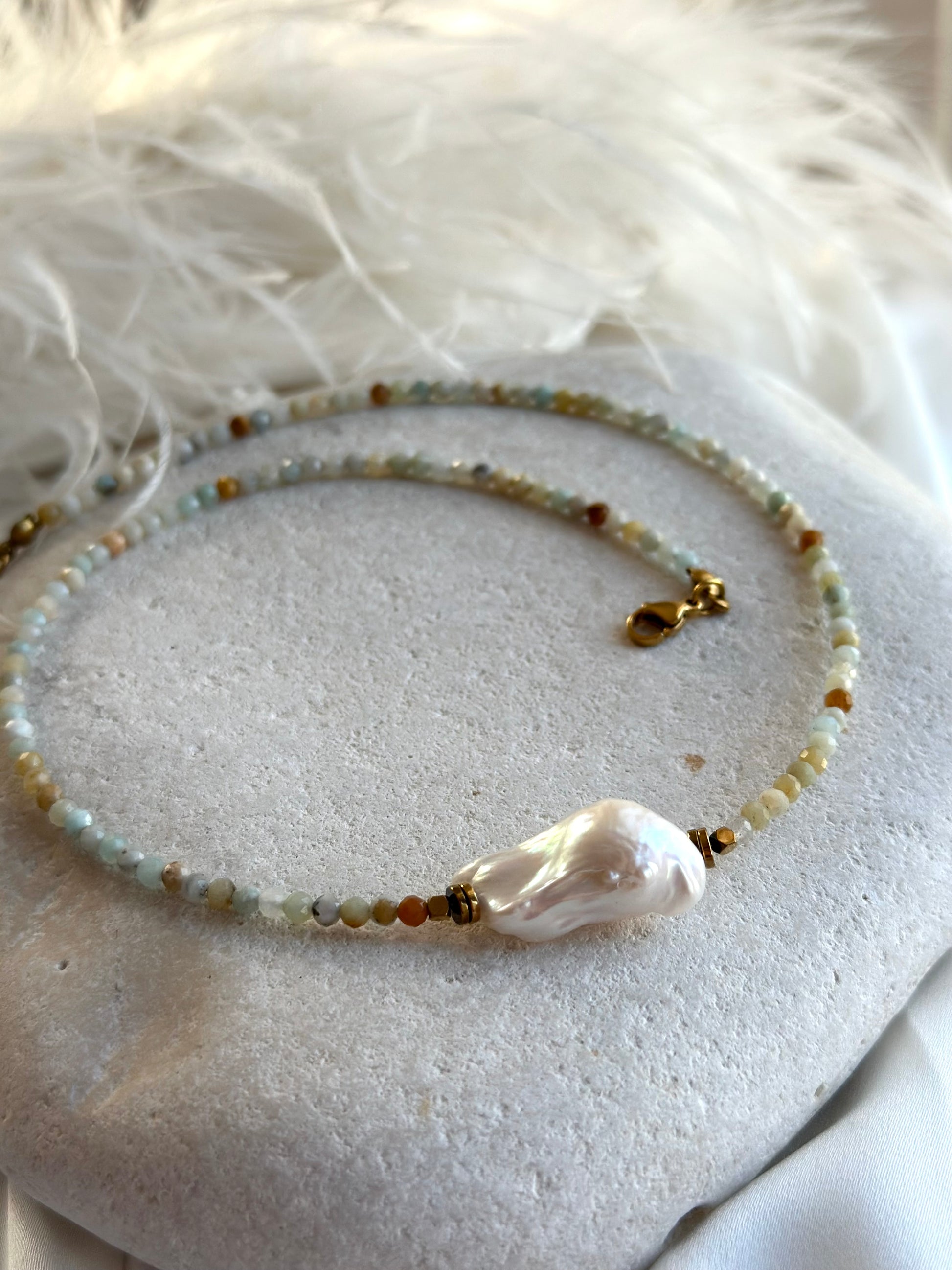 Details: 3 mm großer, facettierter Amazonit. Vergoldete Hämatit-Perlen. 2,5 cm große, barocke Süßwasserperle. Verschluss aus 18-karätig ionenvergoldetem Edelstahl.