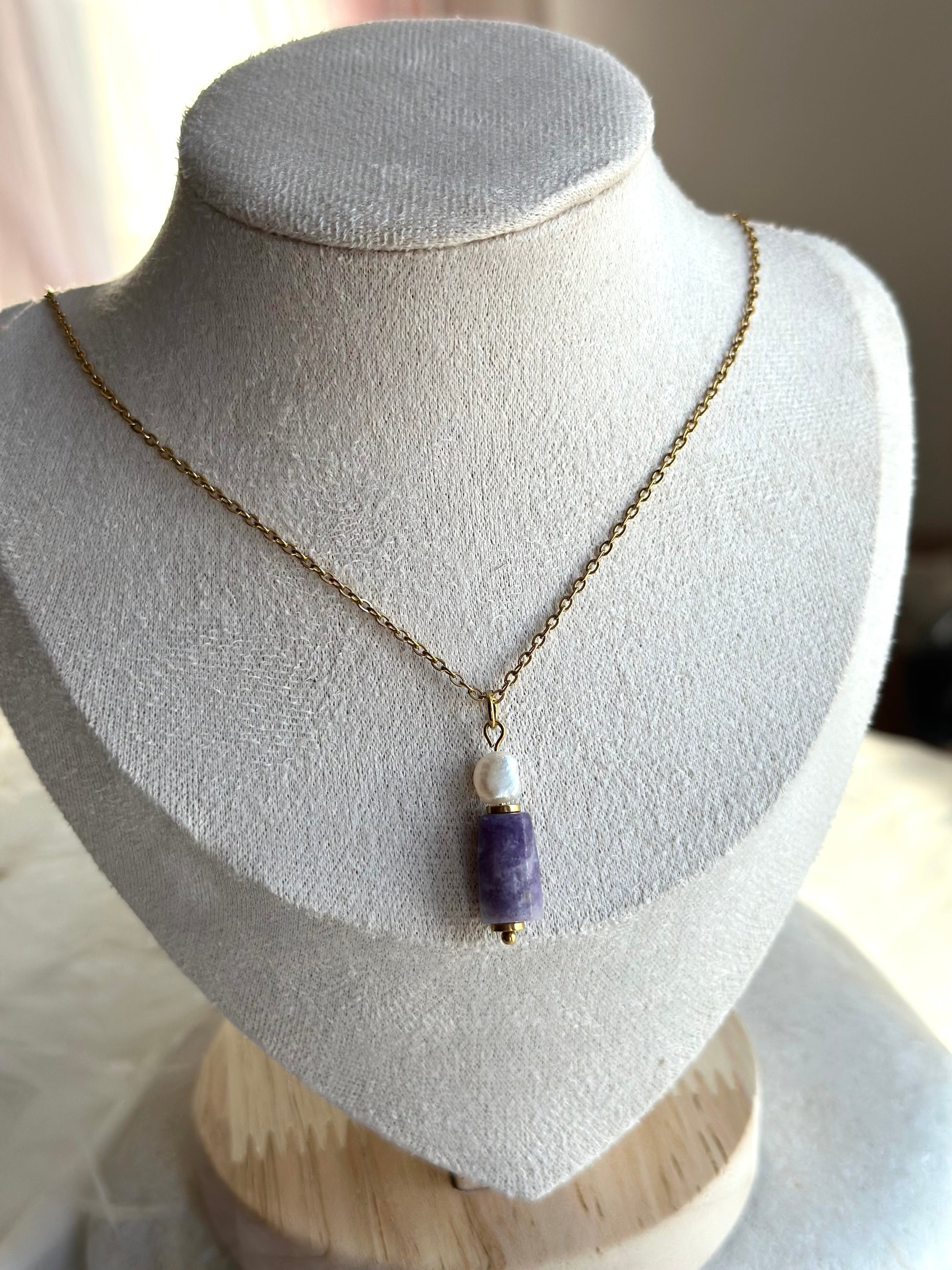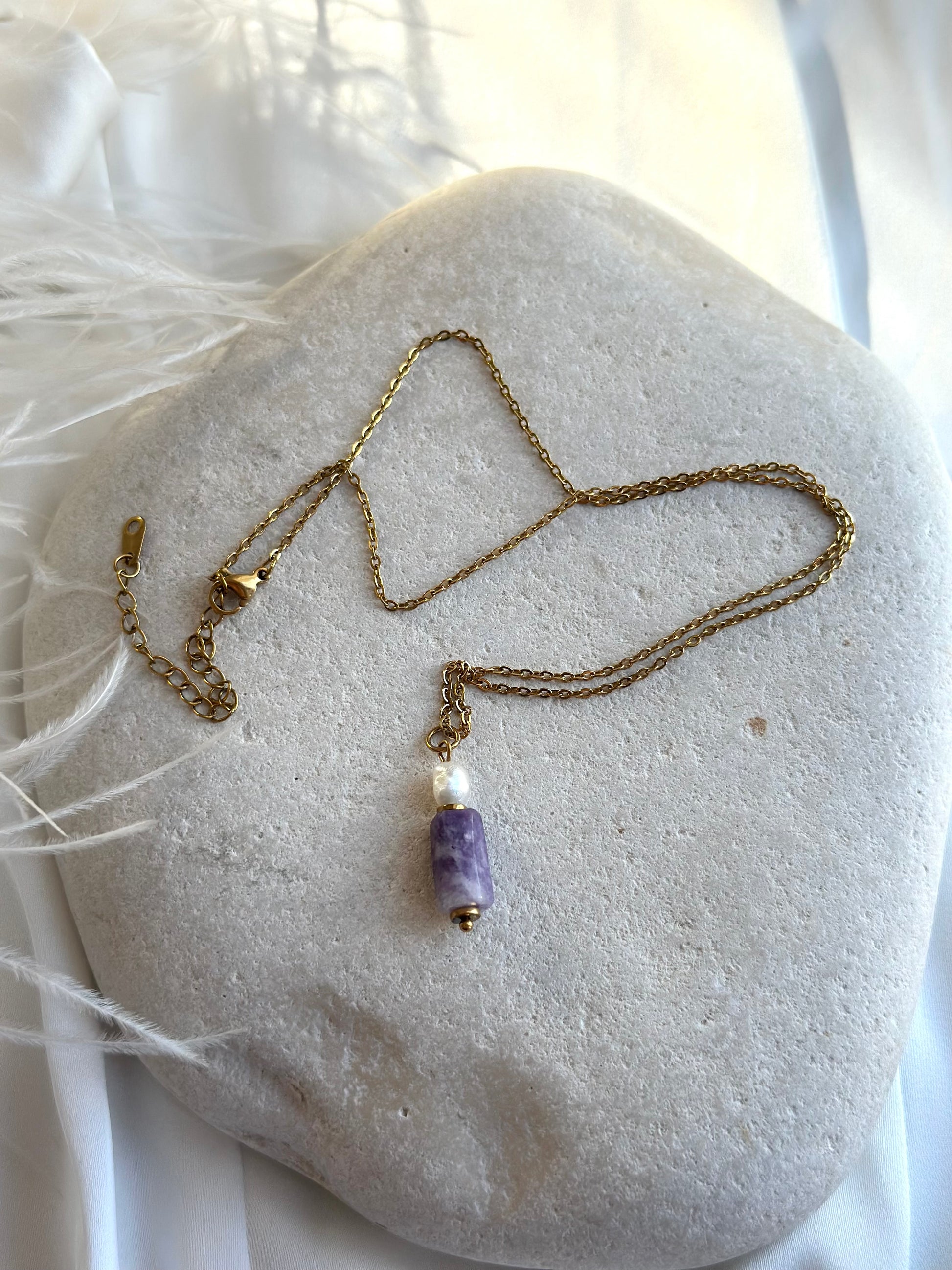 Details: 13 mm Lepidolith. 5–6 mm Süßwasserperle. Vergoldete Hämatitperlen. Kette aus 18-karätig ionenvergoldetem Edelstahl.
