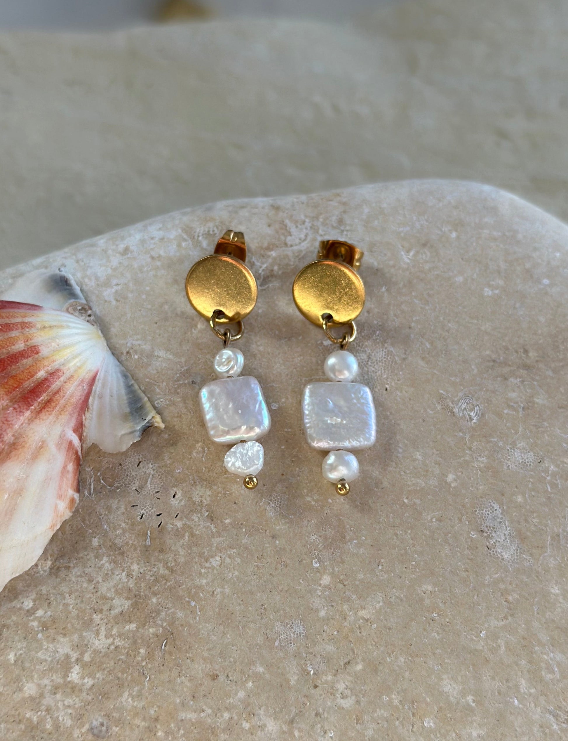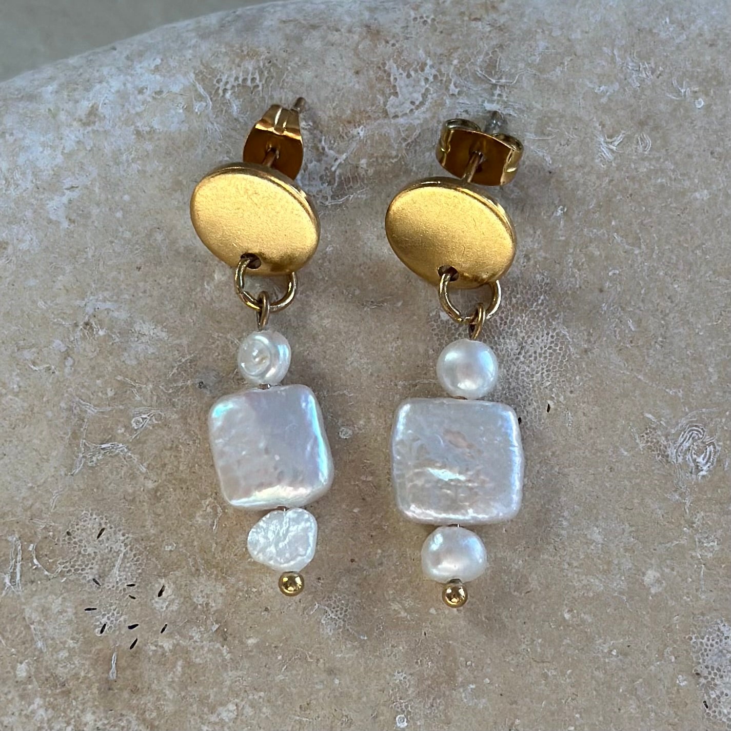 Details: ca. 8 mm quadratische und 4–5 mm große Süßwasserperlen. Ohrstecker aus hypoallergenem Edelstahl, 18 Karat ionenvergoldet.