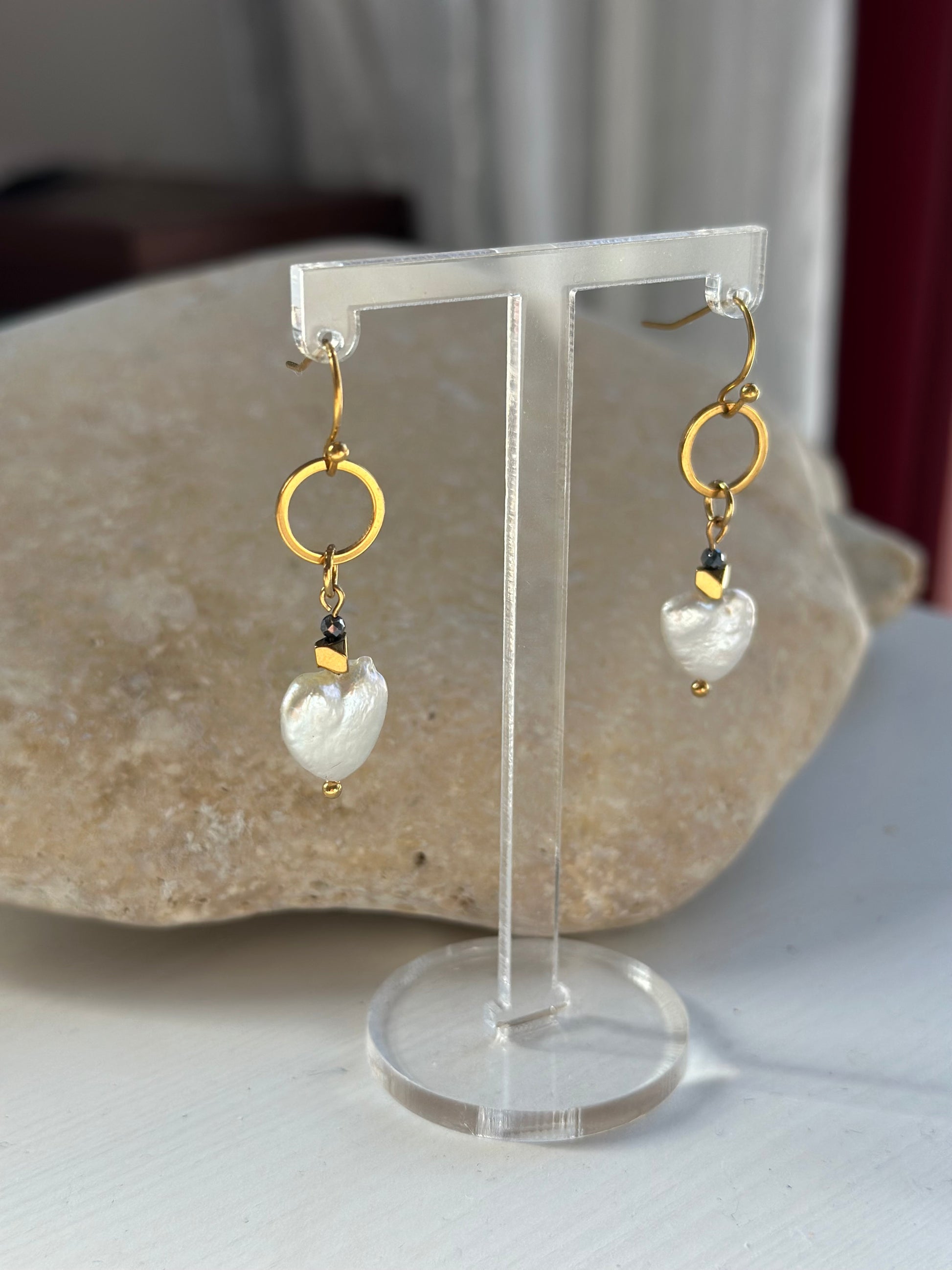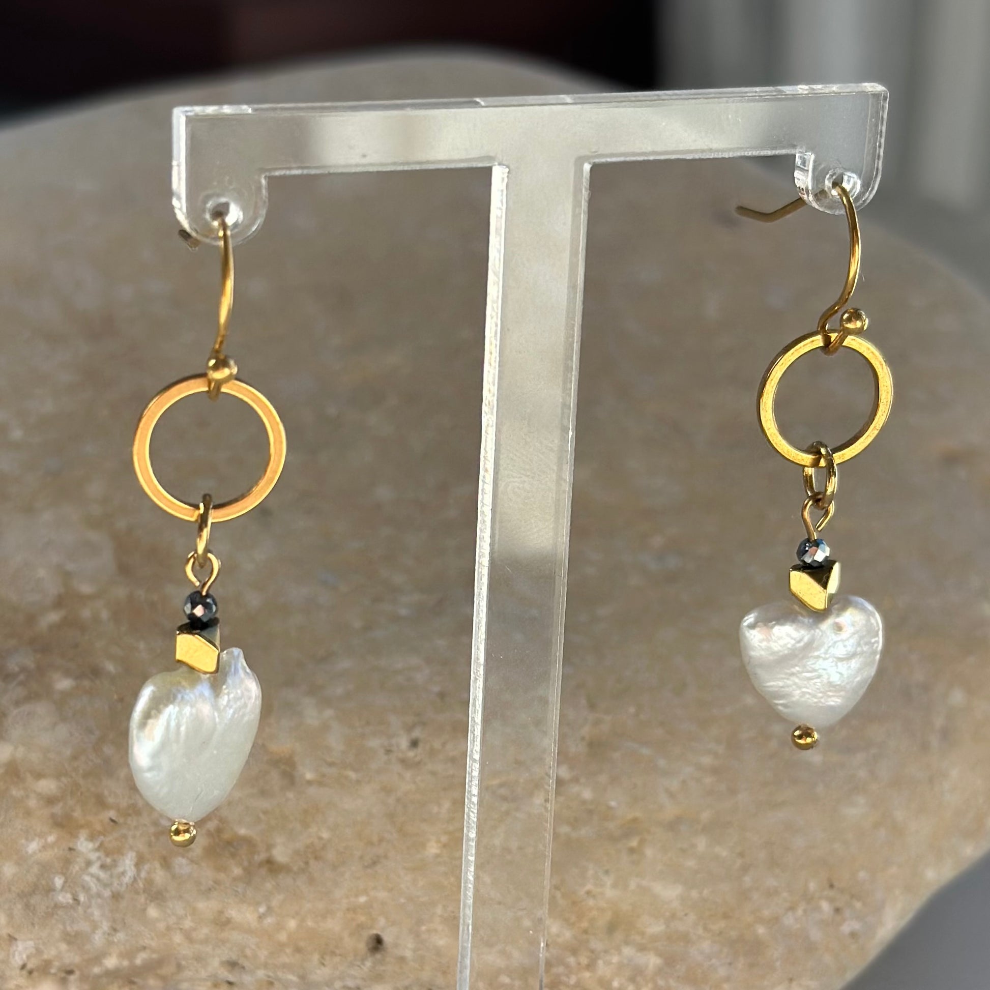 Details: ca. 10 mm große, herzförmige Süßwasserperle. Vergoldete Hämatit-Perlen. 2 mm große, facettierte Teraherz-Perle. 18-karätig ionenvergoldeter, hypoallergener Edelstahlring (10 mm) und Haken.