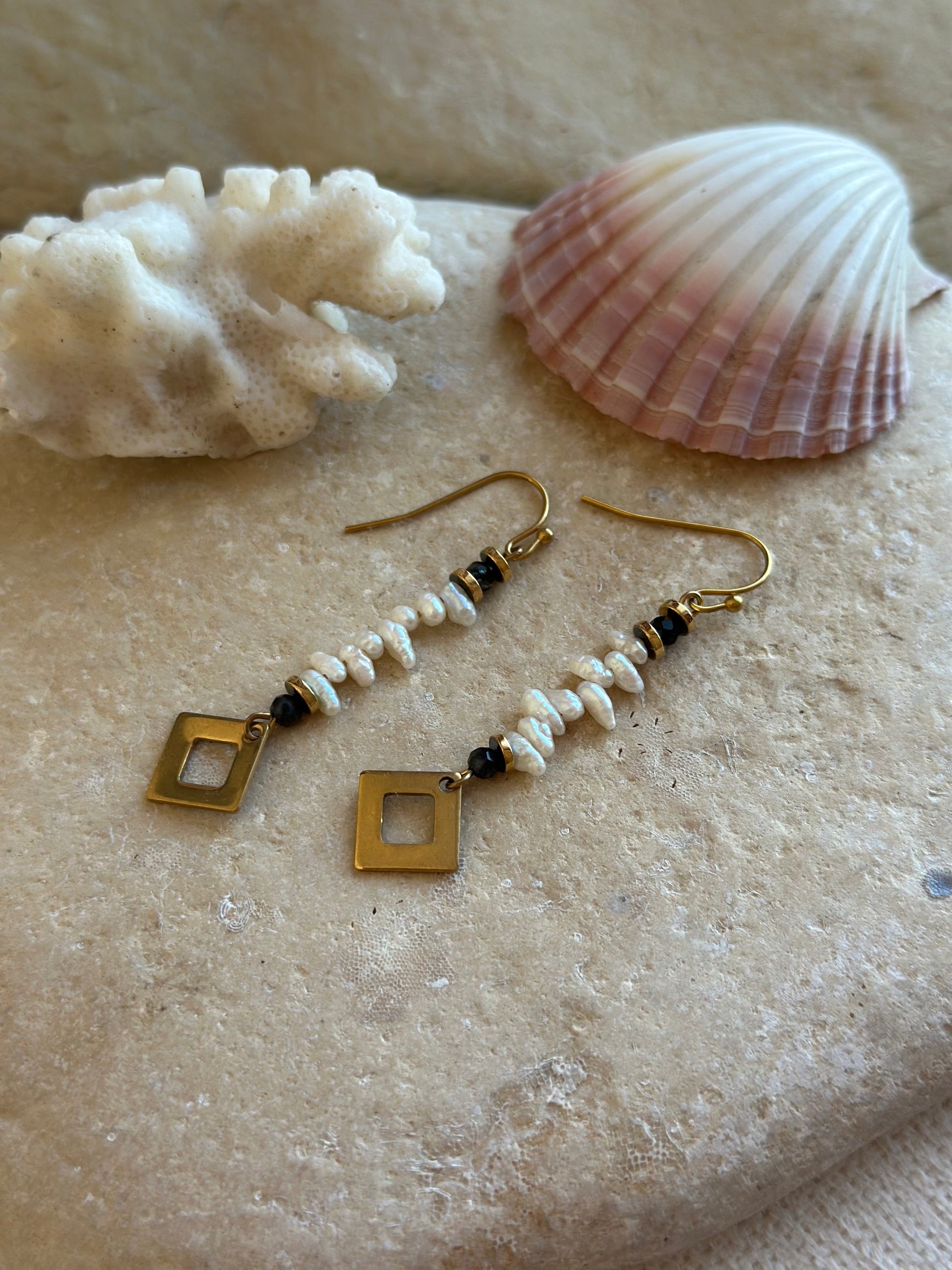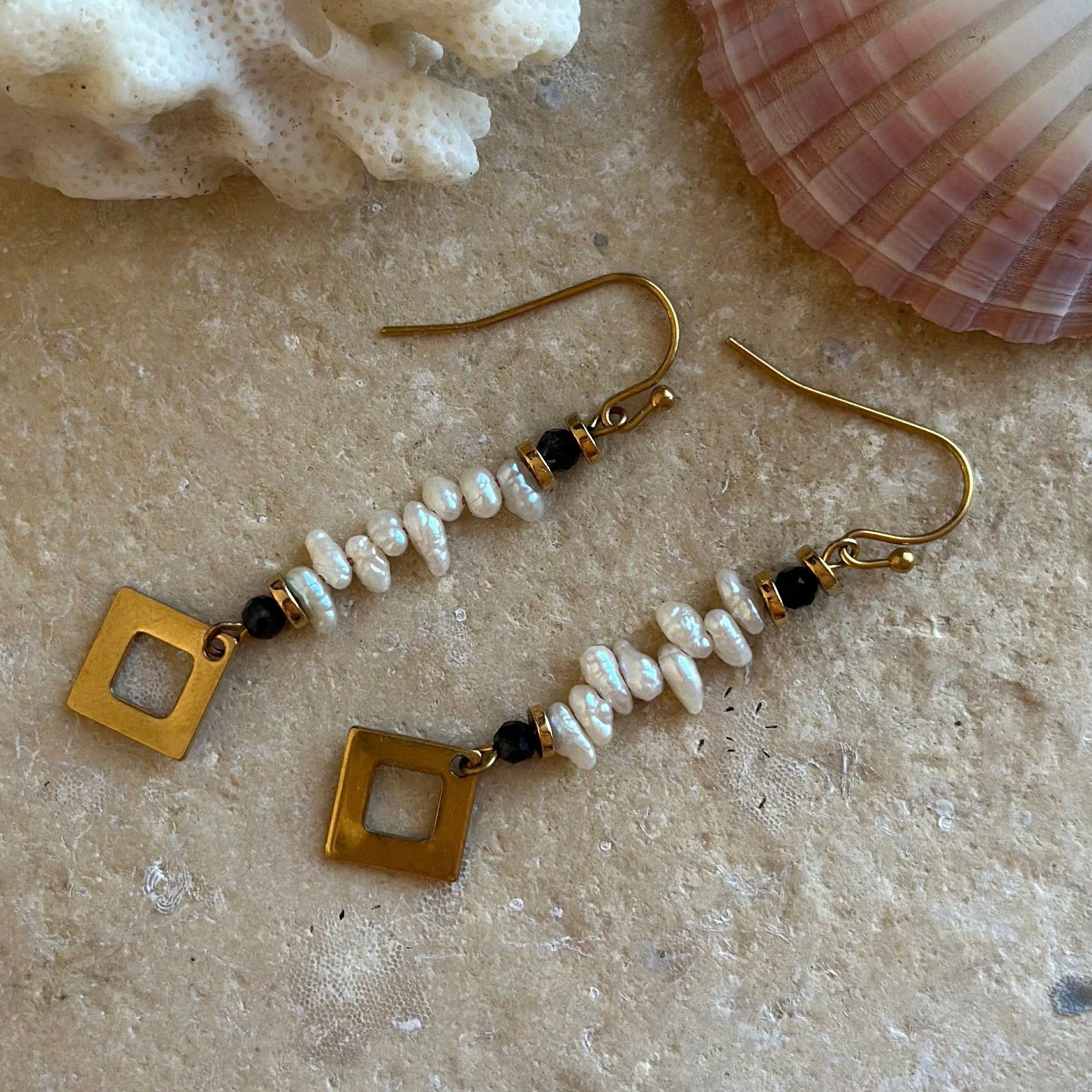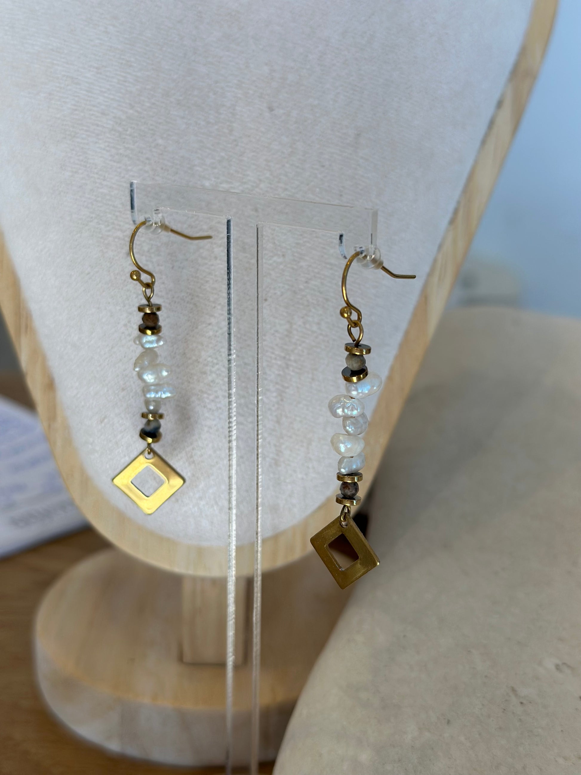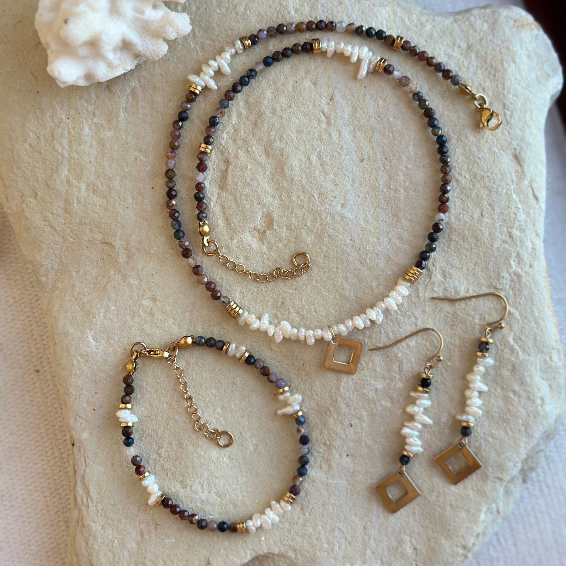 Details: 3 mm großer, facettierter Pietersit. Unregelmäßige Süßwasserperlen. Ohrhaken und quadratischer Anhänger aus hypoallergenem, 18-karätig ionenvergoldetem Edelstahl. Vergoldete Hämatitperlen.
