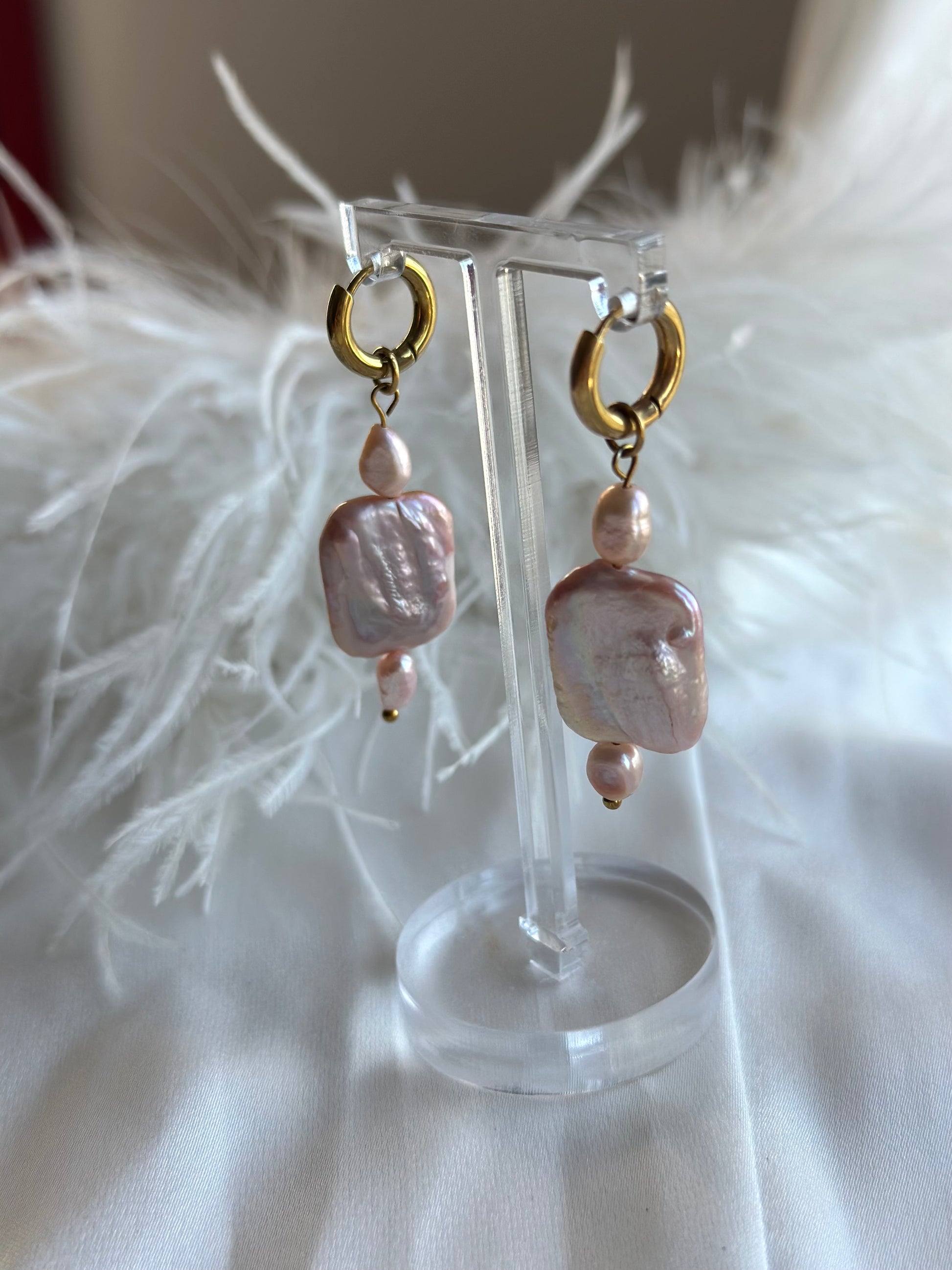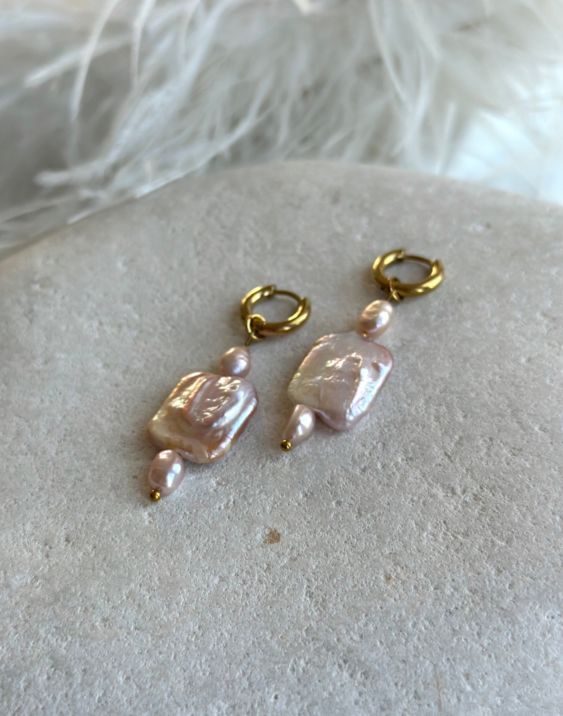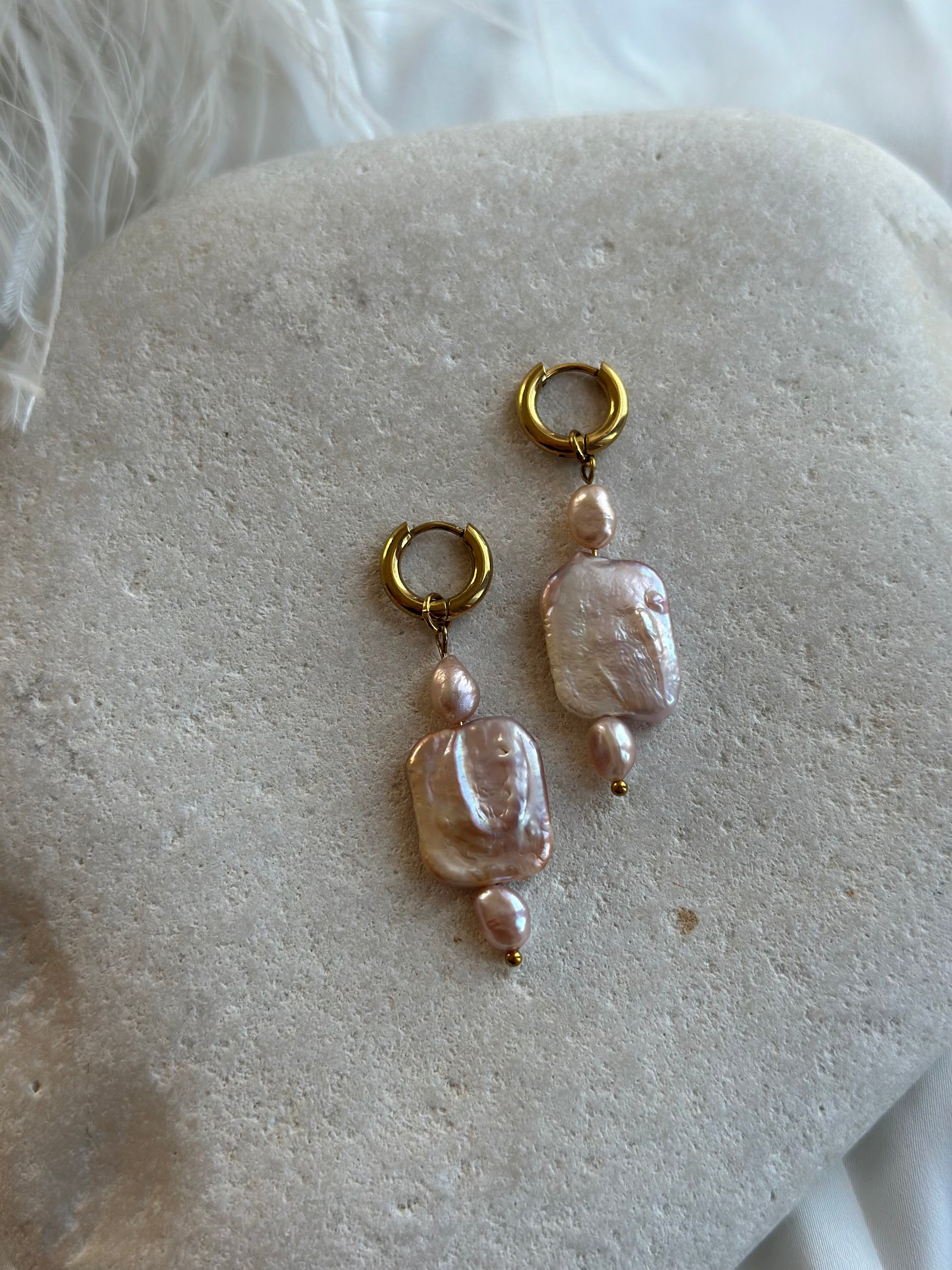 Details: ca. 18 mm quadratische und 5–6 mm große violette Süßwasserperlen. Hypoallergene Edelstahl-Creolen mit 18-karätiger Ionenvergoldung.