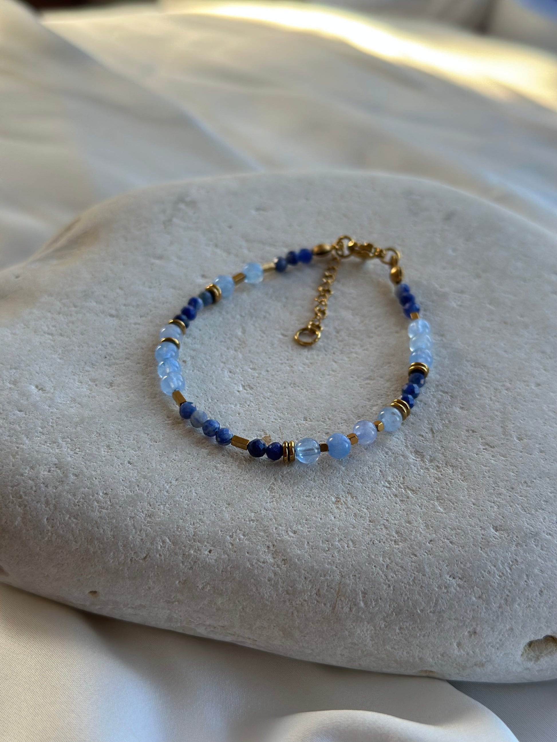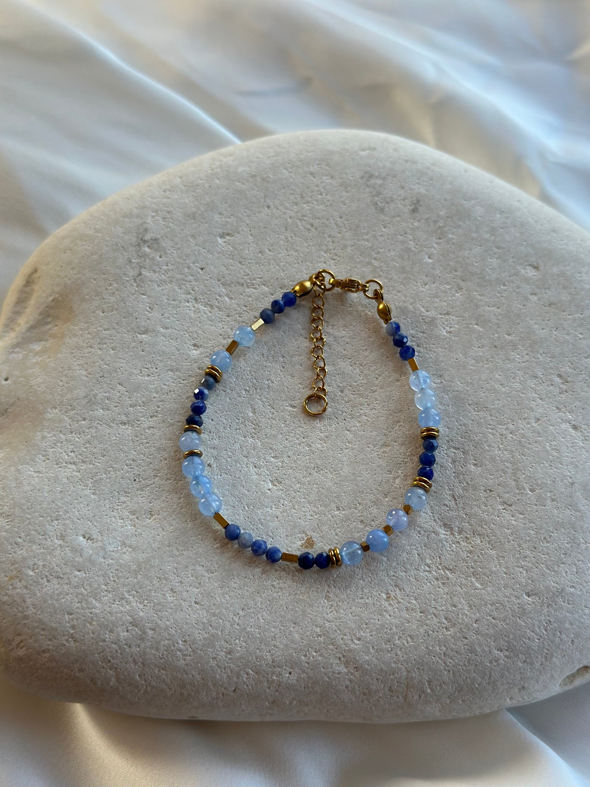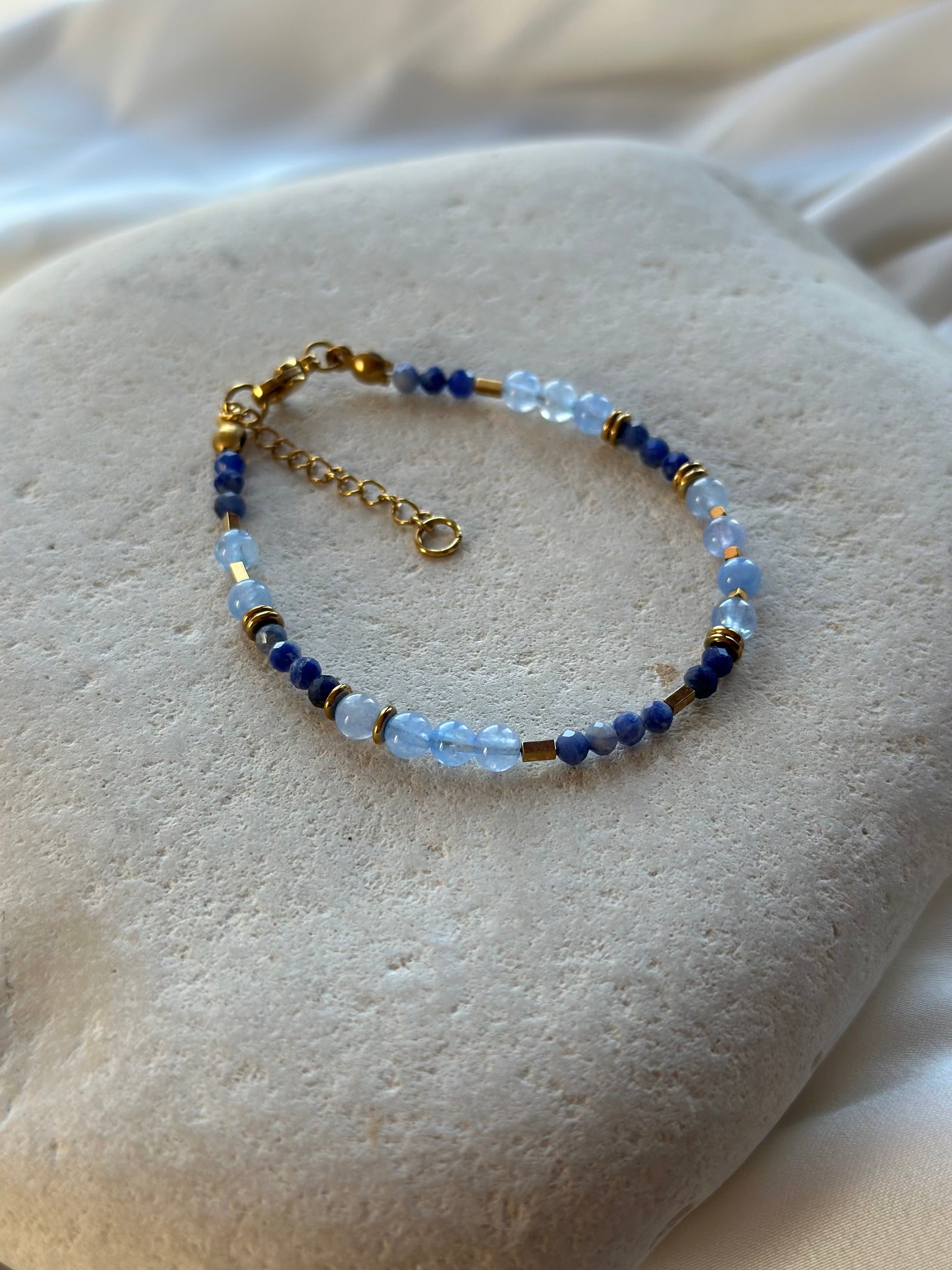 Details: 3 mm Sodalith und 4 mm Aquamarin. Vergoldete Hämatit-Perlen. Verschluss aus 18-karätig ionenvergoldetem Edelstahl.