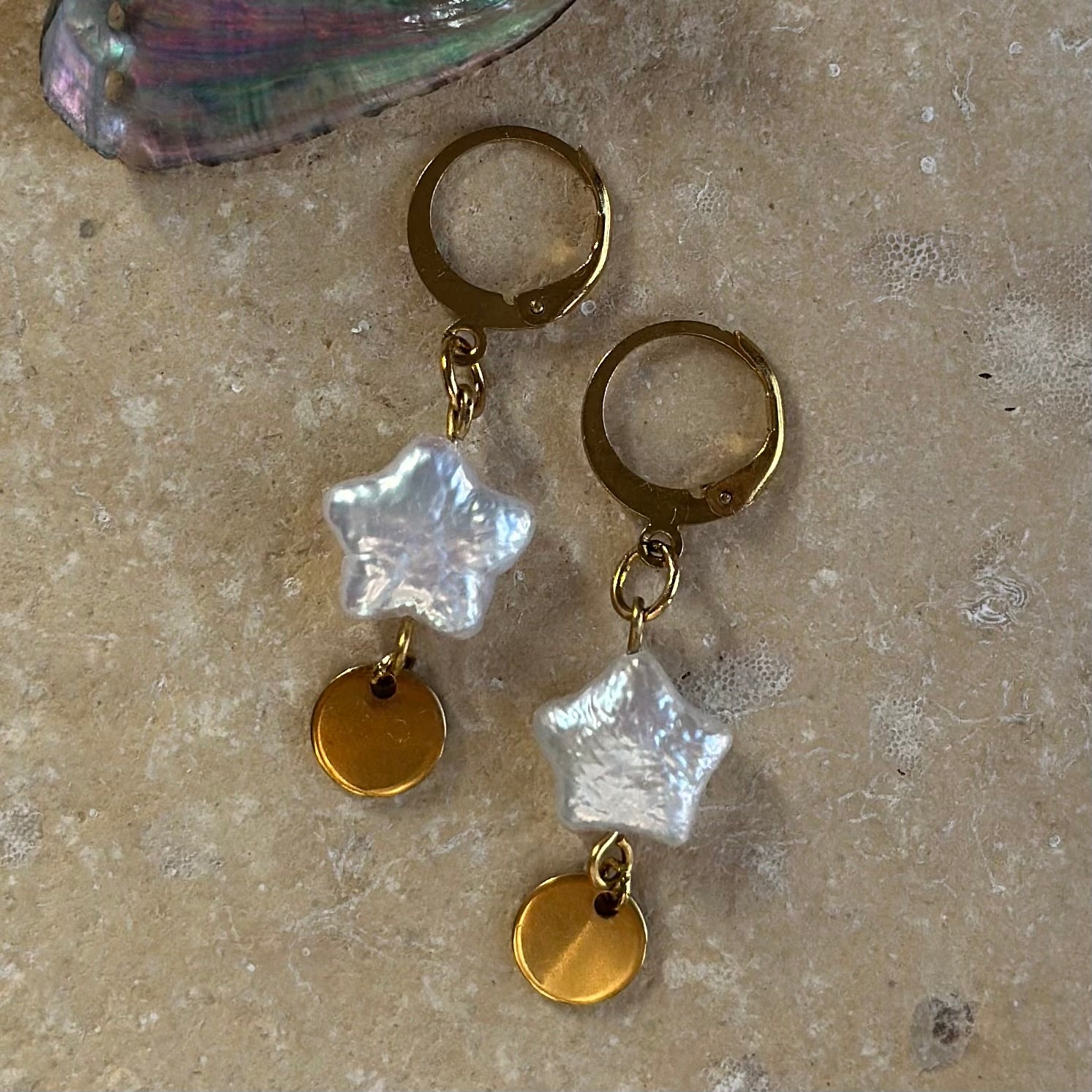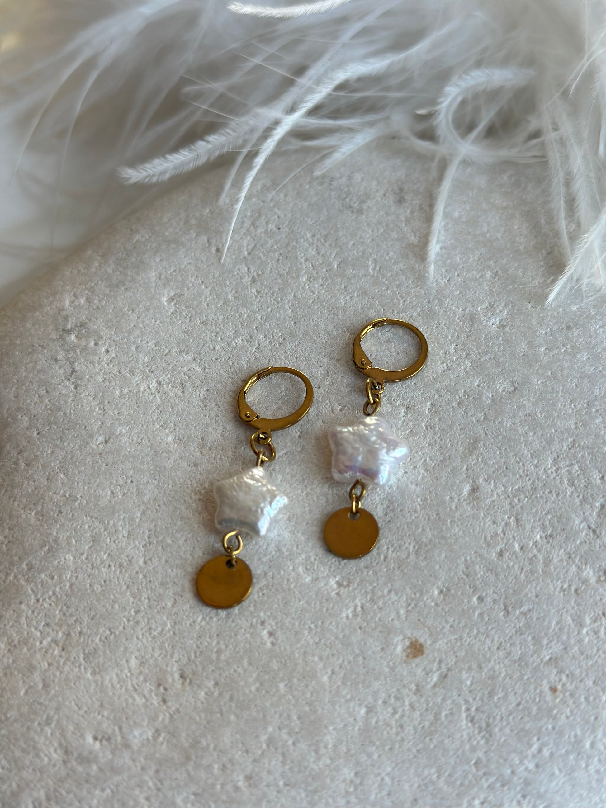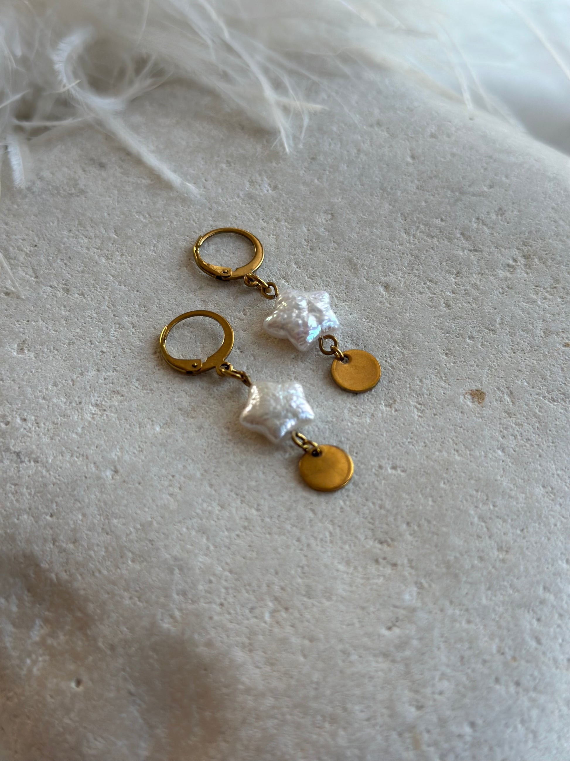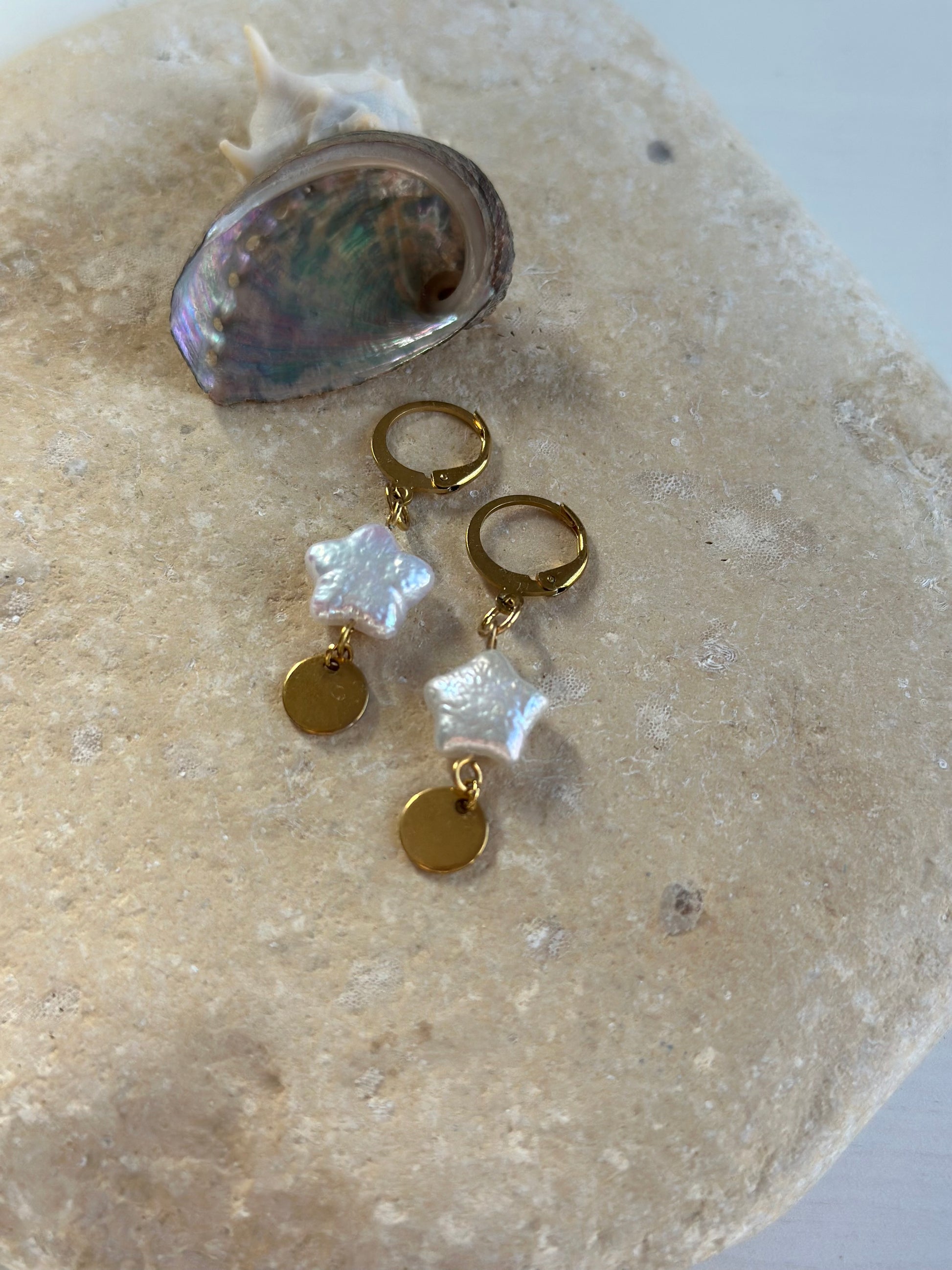 Λεπτομέρειες: μαργαριτάρι γλυκού νερού σε σχήμα αστεριού περίπου 10 mm. Κρίκοι huggie από υποαλλεργικό ανοξείδωτο ατσάλι επιχρυσωμένοι με ιόντα 18 καρατίων και μικρή πλάκα 8 mm.