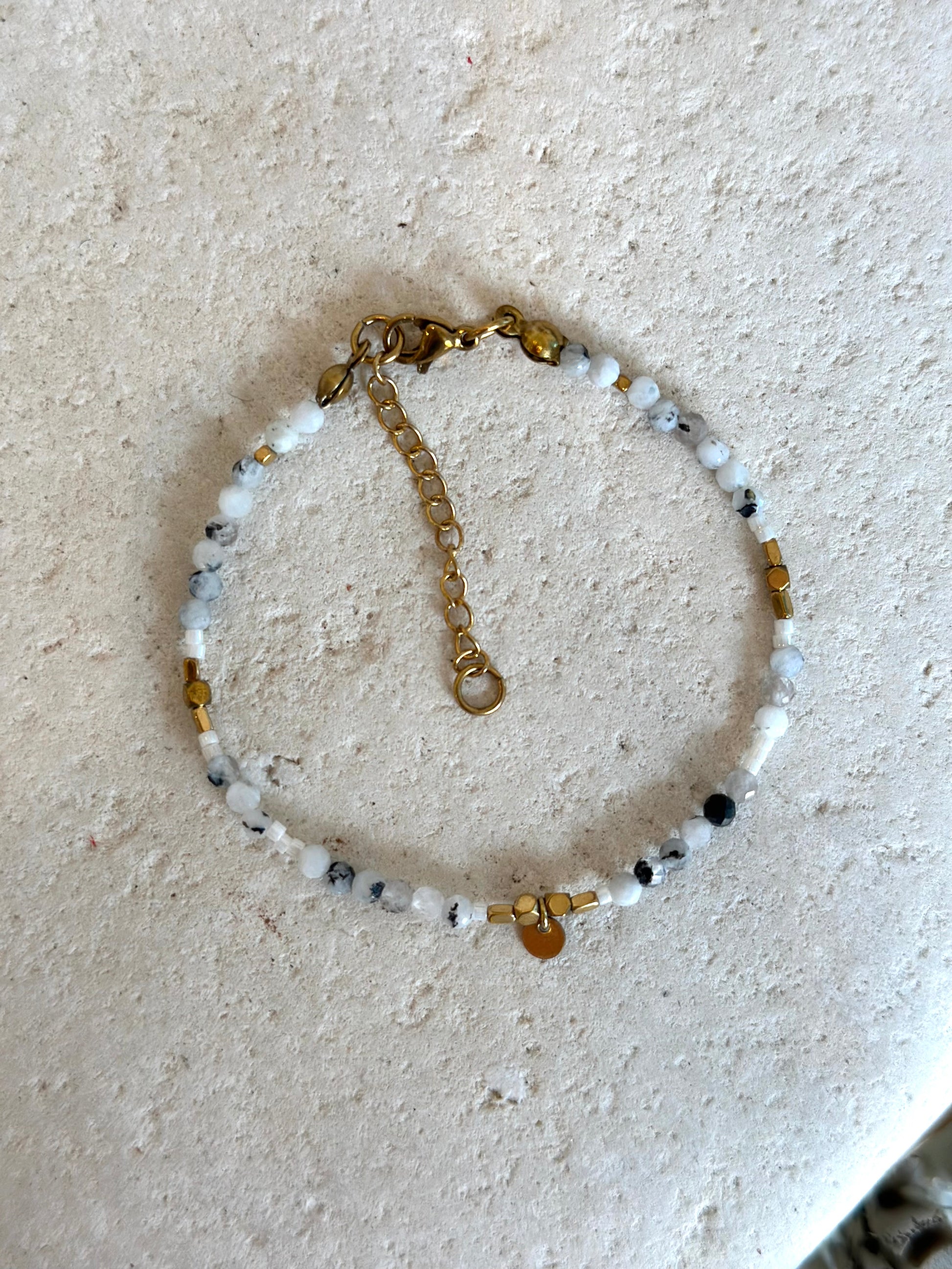 Βραχιόλι: Σεληνόλιθος με όψη 3 χιλιοστών. Επιχρυσωμένες χάντρες Hämatit. Κούμπωμα από ανοξείδωτο ατσάλι 18 καρατίων επιχρυσωμένο με ιόντα.