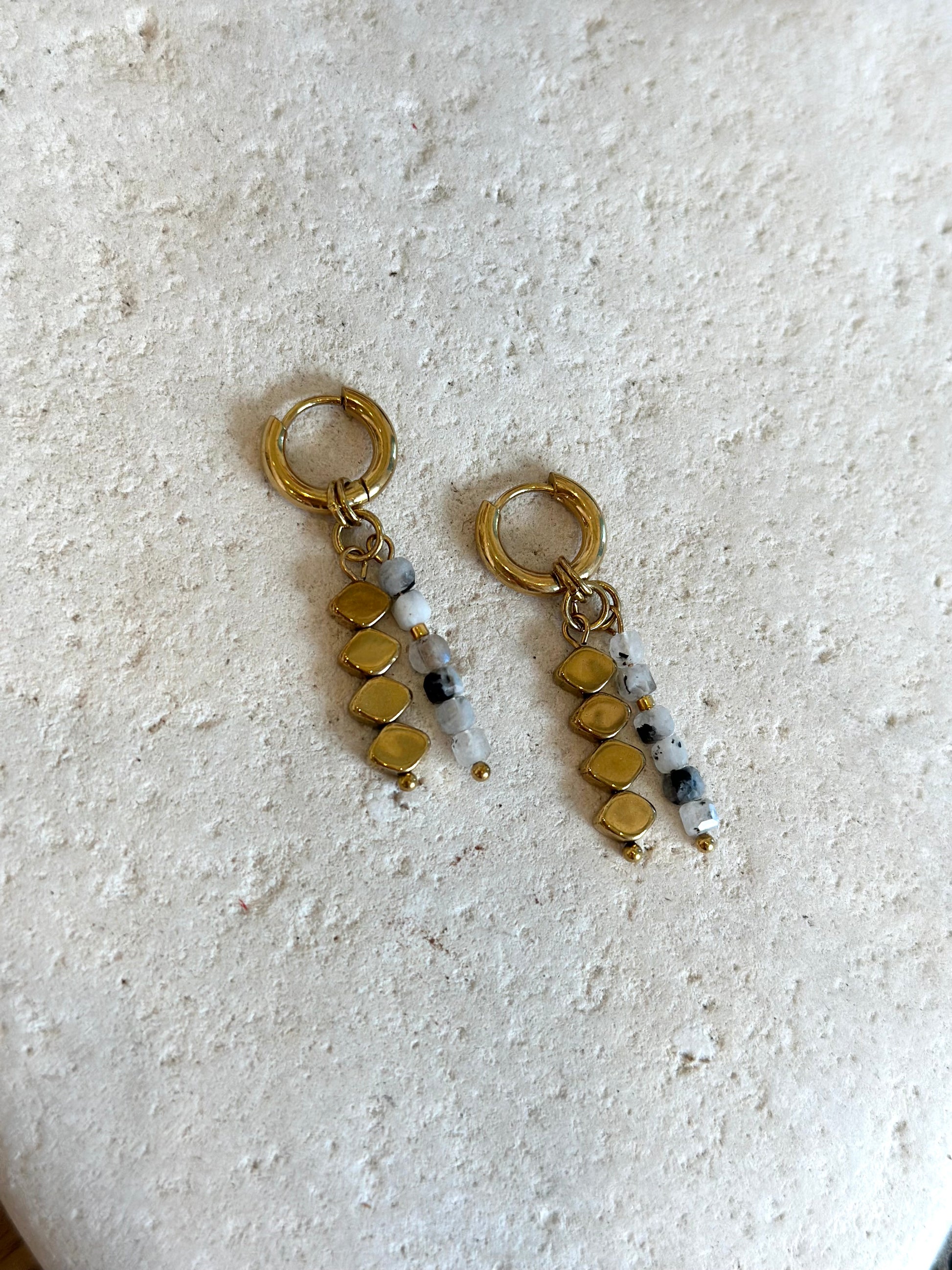 Σκουλαρίκια: Σεληνόλιθος με όψη 4x4 χιλ. Επιχρυσωμένες χάντρες Hämatit. Κρίκοι huggie από υποαλλεργικό ανοξείδωτο ατσάλι 13 χιλ., επιχρυσωμένοι με ιόντα 18 καρατίων.