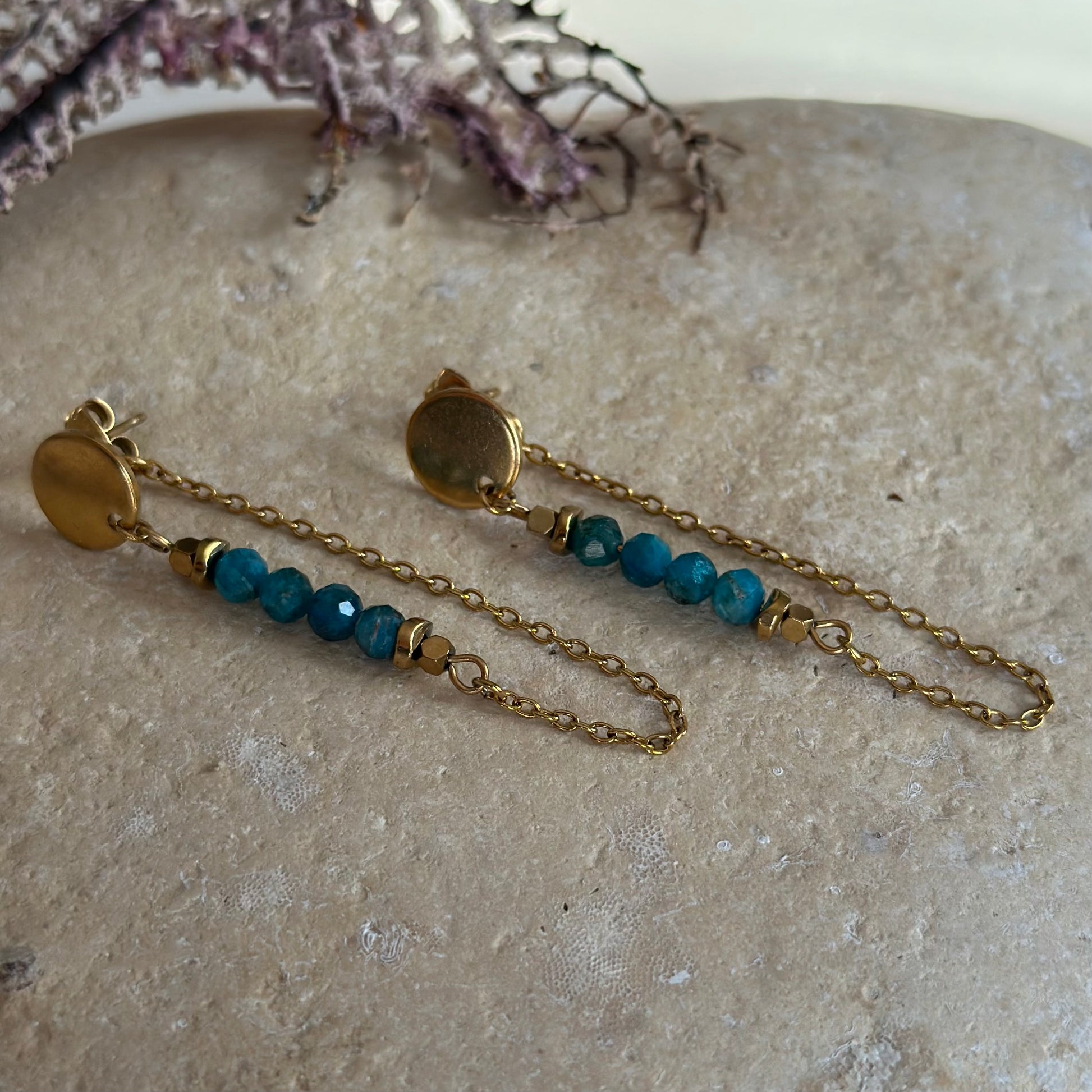 Details: 4 mm faced apatite. 18k ion gold plated hypoallergenic stainless steel stud earrings. Gold plated Hämatit beads. Thin chain that goes to the back of the earring.