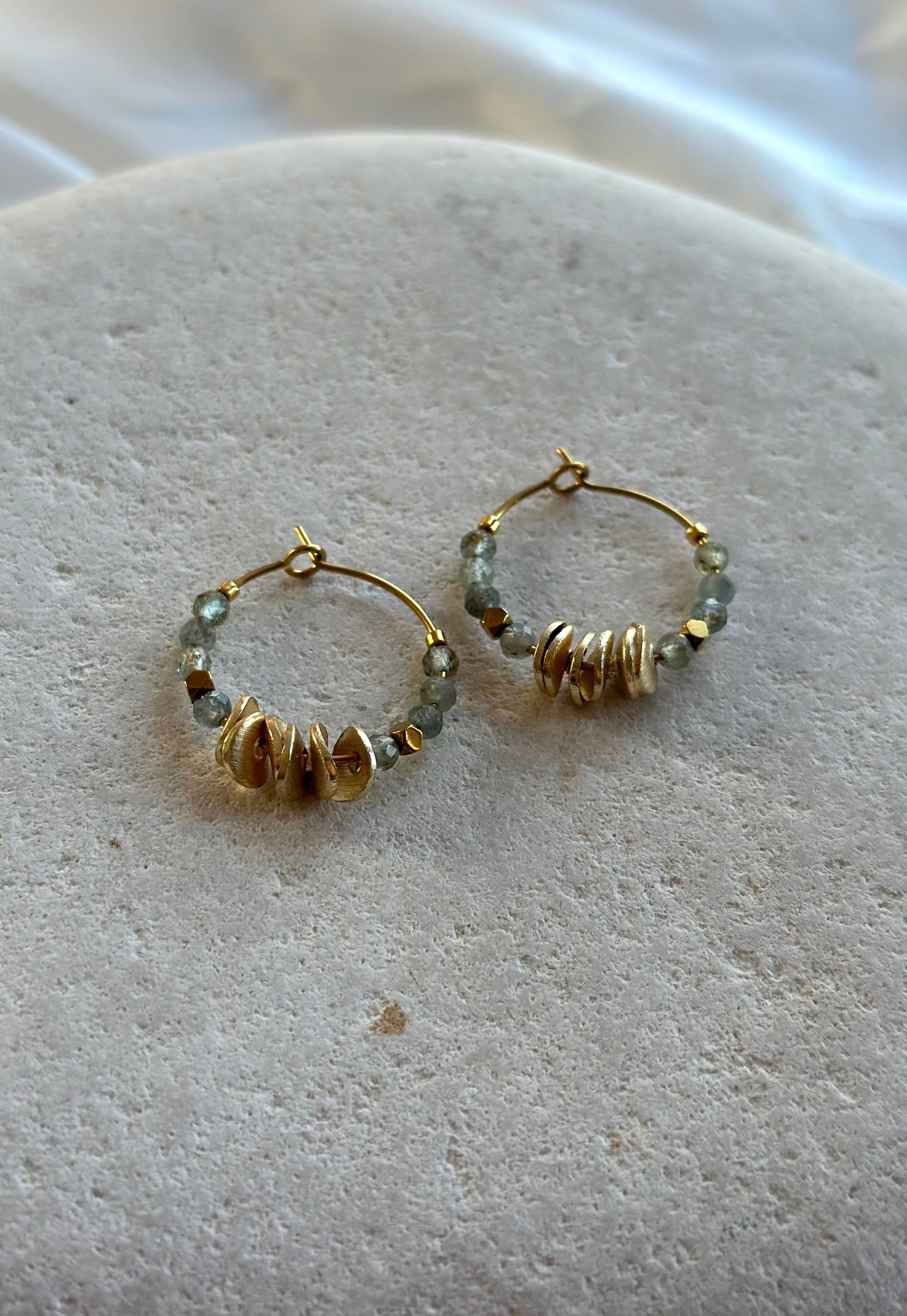 Details: 3 mm faced apatite. Gold plated Hämatit beads. 18k ion gold plated hypoallergenic stainless steel 20 mm wineglass earring.
