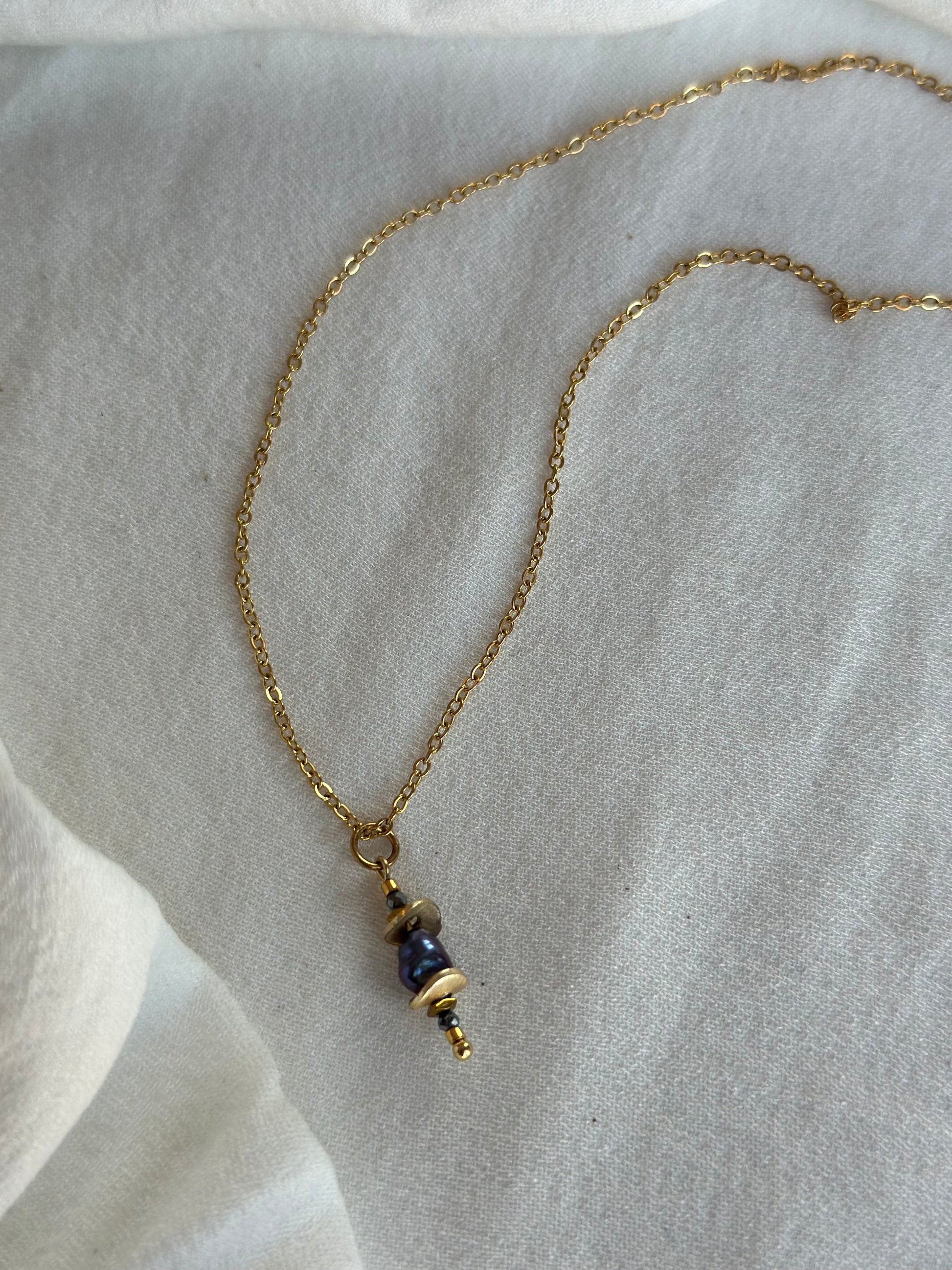 Details: 6 mm black freshwater pearl. 2 mm faced Teraherz. gold plated Hämatit beads. 18k ion gold plated stainless steel chain.