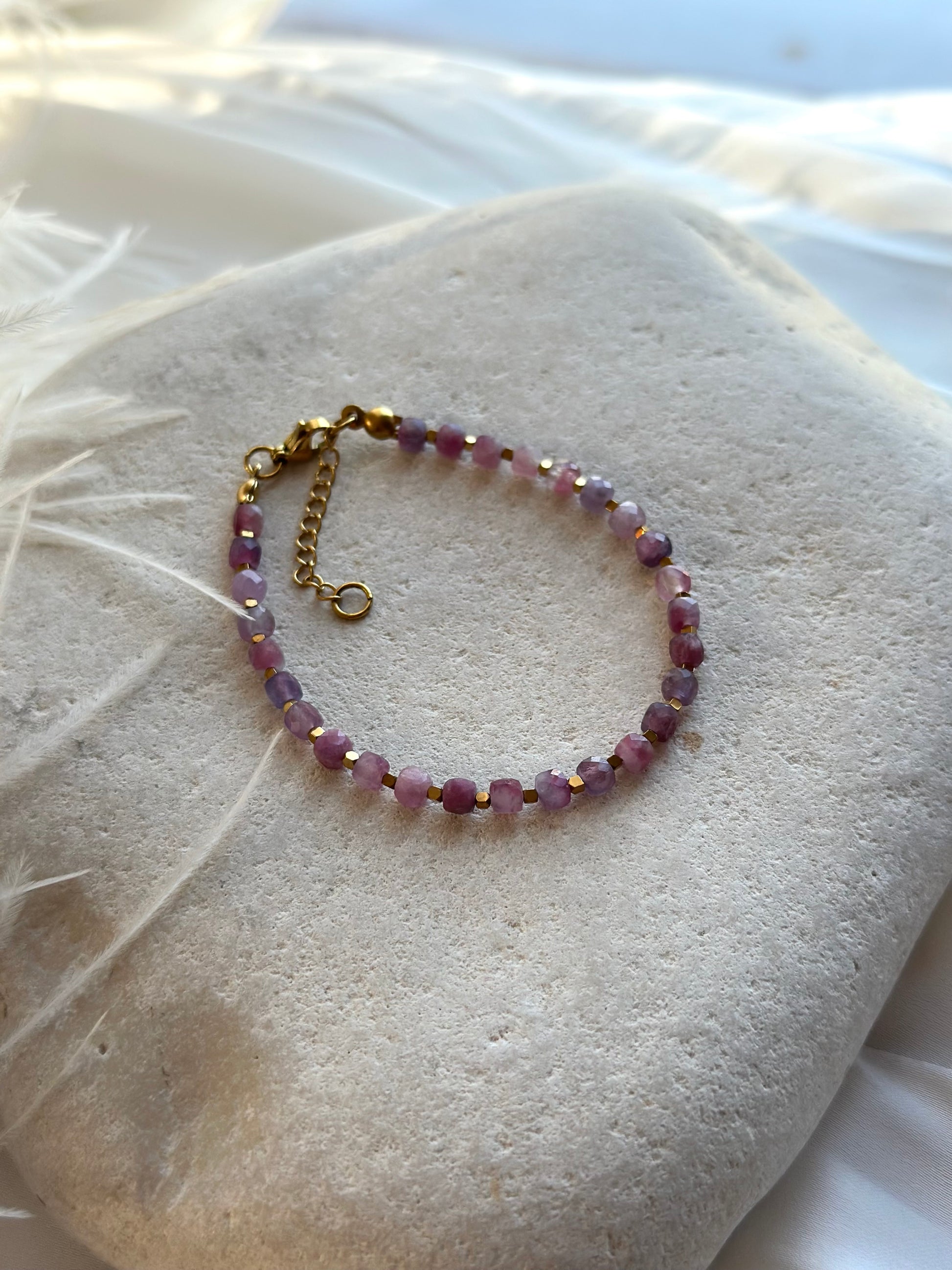 Details: 4x4 mm Rubellit Tourmaline. 1x1 mm gold plated Hämatit beads. 18k ion gold plated stainless steel clasp.